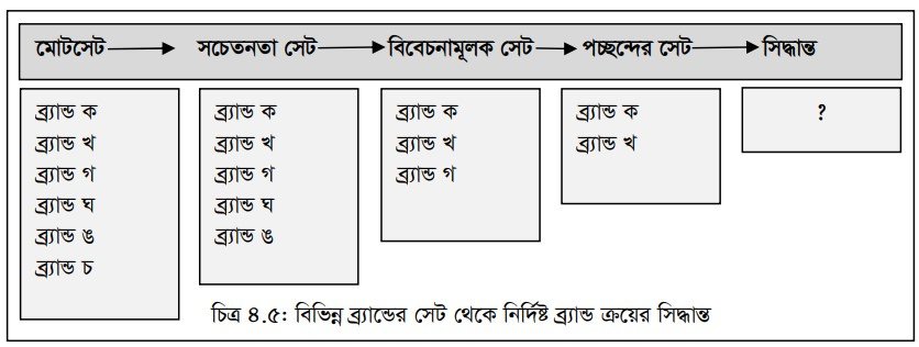 এসব উৎসগুলোর মধ্যে ক্রেতা কোনো উৎস থেকে তথ্য সংগ্রহ করবে তা নির্ভর করবে পণ্যের প্রকৃতি এবং ভোক্তা চাহিদার তীব্রতার ওপর। ভোক্তা উল্লেখিত উৎসের সবগুলো অথবা এদের সমন্বয় করে তথ্য সংগ্রহ করতে পারে। চিত্র নং ৪.৫ এ দেখানো হয়েছে বিভিন্ন উৎস থেকে তথ্য সংগ্রহ করে পণ্যের সকল ব্র্যান্ডের মোটসেট নির্ধারণ করে সেখান থেকে একটি নির্দিষ্ট ব্র্যান্ড ক্রয়ের সিদ্ধান্ত গ্রহণ করা হয়।
