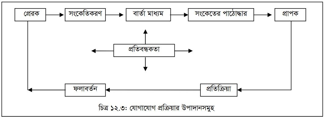 যোগাযোগ পদ্ধতির ম্যাক্রোমডেল এ নয়টি উপাদান রয়েছে। যা চিত্র ১২.৩ এ দেখানো হয়েছে। যোগাযোগ প্রক্রিয়ায় সর্বপ্রথম বার্তা প্রেরক বা যোগাযোগকারী কী বিষয় নিয়ে যোগাযোগ করবে, সে বিষয়টি ঠিক করতে হয়। অর্থাৎ, প্রেরক কী বিষয়ে, কখন, কোথায়, কীভাবে যোগাযোগ করতে চায় তার একটি রূপরেখা নির্ধারণ করবে। তাই, যোগাযোগ প্রক্রিয়ার এ স্তরকে পরিকল্পনা স্তরও বলা হয়ে থাকে। প্রাপক যেন সহজেই মূল বিষয়টি উপলব্ধি করতে পারে এজন্য প্রেরককে বিভিন্ন শব্দ, সংকেত, প্রতীক বা কোডের সাহায্যে সুশৃঙ্খলভাবে ও সহজে বোধগম্য ভাষায় প্রেরণ করতে হয় যেন প্রাপক সহজে বুঝতে পারে।