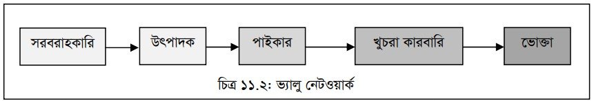 চিত্র ১১.২ এ ভ্যালু নেটওয়ার্ক দেখানো হলো- ভ্যালু নেটওয়ার্ক বিভিন্ন পরিপ্রেক্ষিত তৈরি করে। প্রথমত, সরবরাহ ও বণ্টনের সমন্বয়ের জন্য একটি কোম্পানি সরবরাহ ও বণ্টন ব্যবস্থায় কী পরিমাণ অতিরিক্ত অর্থ সরবরাহ করতে হবে তা নির্ধারণ করে। দ্বিতীয়ত, সরবরাহ চেইনের খরচ বা যে কোনো পরিবর্তন ও সমস্যা সম্পর্কে কোম্পানিকে সচেতন করে। তৃতীয়ত, ইন্টারনেটে লেনদেন ও অর্থ পরিশোধের ফলে ভ্যালু নেটওয়ার্ক কম খরচে ও দ্রুততার সাথে কাজ করতে পারে। পাঠ ২.১ এ বিস্তারিত আলোচনা করা হয়েছে ।