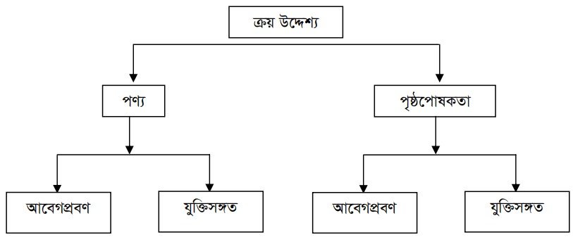 পণ্য এবং পৃষ্ঠপোষকতামূলক ক্রয় উদ্দেশ্যকে আবার দুটি শ্রেণিতে ভাগ করা যায়, যেমন আবেগপ্রবণ ও যুক্তিসঙ্গত ক্রয় উদ্দেশ্য, আবেগপ্রবণ ক্রয়ের ক্ষেত্রে ক্রেতা তার আবেগ দ্বারা তাড়িত হয়। এখানে ক্রেতাদের মর্যাদা, সম্মানবোধ, ভালবাসা, আনন্দ ইত্যাদি মনস্তাত্ত্বিক বিষয়গুলো কাজ করে। কিন্তু যুক্তিসঙ্গত ক্রয়ের ক্ষেত্রে ক্রেতা তার স্বাভাবিক বিচারবুদ্ধির প্রয়োগ দ্বারা ক্রয় সিদ্ধান্ত গ্রহণ করে। যুক্তিসঙ্গত ক্রয়ের ক্ষেত্রে ক্রেতা পণ্যের তুলনামূলক গুণ, মান, মূল্য, পণ্য সুবিধা ইত্যাদি বিষয়গুলো বিবেচনা করে থাকে। নিম্নে চিত্রে ক্রেতাদের ক্রয় উদ্দেশ্যের শ্রেণিবিভাগ দেখানো ও বর্ণনা করা হলো –