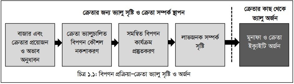 বিপণন মানুষের প্রয়োজন ও চাহিদা পূরণের জন্য পণ্য ও সেবা প্রস্তুত করে ভোক্তাদের প্রয়োজন ও সন্তুষ্টি বিধান করে থাকে। চিত্র ১.১-এ বিপণন প্রক্রিয়ায় দেখানো হয়েছে যে, পাঁচটি পর্যায়ে কীভাবে কোনো প্রতিষ্ঠান ক্রেতা ভ্যালু সৃষ্টি ও অর্জন করতে পারে। বিপণনকারী ক্রেতা ভ্যালু ও ক্রেতা সম্পর্ক তৈরি করার জন্য প্রথমত, বাজার ও ক্রেতার কী কী প্রয়োজন ও অভাব রয়েছে তা জানার জন্য বিভিন্ন কার্যক্রম গ্রহণ করে। ক্রেতা সম্পর্কে ধারণা পাওয়ার পর দ্বিতীয় পর্যায়ে, ক্রেতা ভ্যালু তৈরির জন্য বিপণন কৌশল গ্রহণ করে; তৃতীয় ধাপে, সমন্বিত বিপণন কার্যক্রম প্রস্তুত করে, এবং চতুর্থ পর্যায়ে, লাভজনক সম্পর্ক তৈরির জন্য বিভিন্ন পদক্ষেপ গ্রহণ করে। সর্বশেষে, ক্রেতা ভ্যালু ও ক্রেতা সম্পর্ক তৈরির বিনিময়ে বিপণনকারী মুনাফা ও ক্রেতা ইক্যুইটি অর্জন করে।