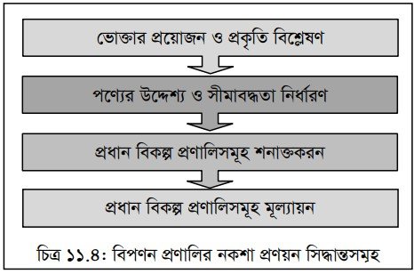 বিপণন প্রণালি এক ধরনের বিনিয়োগ এই কারণে অনেক হিসাব নিকাশ করে বিপণন প্রণালির নকশা প্রণয়ন করতে হয়। যদি সঠিক বিবেচনায় এই প্রণালি প্রণয়ন না করা হয় তবে একটি প্রতিষ্ঠান ক্ষতিগ্রস্থ হয়। ধরা যাক- কোন প্রণালির জন্য সরাসরি বিপণন প্রয়োজন সেখানে যদি দ্বিস্তর বিশিষ্ট বিপণন প্রণালি ব্যবহার করা হয়ে থাকে তবে বিপণন খরচের পরিমাণ বৃদ্ধি পাবে এবং মূল্যের উপর প্রভাব বিস্তার করবে। ফলে পণ্যের বিক্রয় কম হবে। তাই অনেক বিষয় বিবেচনা করে বিপণন প্রণালির নকশা প্রণয়ন করতে হয়; যা চিত্র ১১.৪ এ দেখানো হয়েছে। নিম্নে বিষয়গুলি আলোচনা করা হলো-