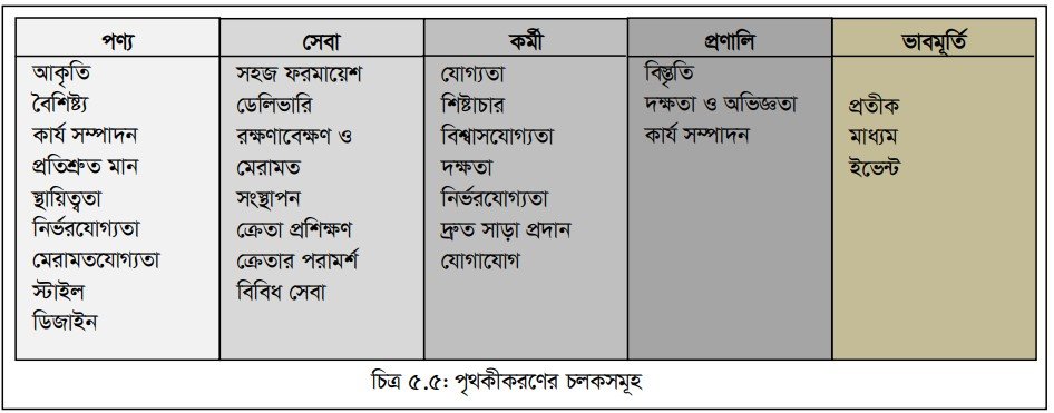 পৃথকীকরণের মাধ্যমে প্রতিষ্ঠান দীর্ঘদিন ধরে প্রতিযোগিতায় টিকে থাকতে পারে। বিপণনকারী সাধারণত পাঁচটি উপায়ে তার বিপণন অফারকে পৃথকীকরণ করে থাকে, যা চিত্র ৫.৫-এ দেখানো হলো ।