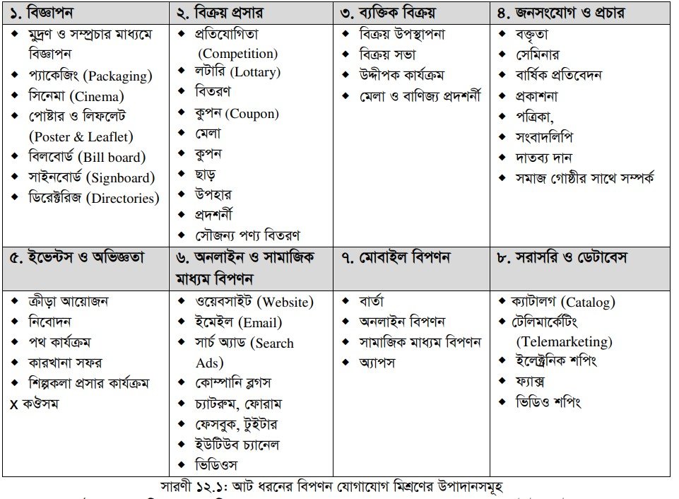 আধুনিক প্রযুক্তির ব্যবহার বেড়ে যাবার কারণে বিপণন যোগাযোগের জন্য নতুন নতুন মাধ্যম অন্তর্ভুক্ত হচ্ছে। যদিও বিজ্ঞাপন প্রচার হলো সবচেয়ে প্রচলিত ও জনপ্রিয় যোগাযোগ মাধ্যম, কিন্তু বর্তমানে বিভিন্ন পারস্পরিক মিথষ্ক্রিয় (Interactive) প্রক্রিয়া ব্যবহৃত হচ্ছে। ক্রেতা ও ভোক্তার সাথে যোগাযোগ কার্যকর করার জন্য প্রচলিত যোগাযোগ মাধ্যমের সাথে নতুন নতুন যোগাযোগের মাধ্যমের ব্যবহার করা হচ্ছে। বিপণন যোগাযোগ মিশ্রণে প্রধানত আট ধরনের যোগাযোগের মাধ্যম রয়েছে; তা ১২.১ চিত্রে দেখানো হয়েছে। সারণী নং ১২.১ ও ১২.২ এ বিপণন মিশ্রণের উপাদানগুলোর মাধ্যমসমূহ ও বৈশিষ্ট্যগুলো সংক্ষিপ্ত আকারে তুলে ধরা হয়েছে। নিম্নে বিপণন যোগাযোগ মিশ্রণের উপাদানগুলো আলোচনা করা হলো-