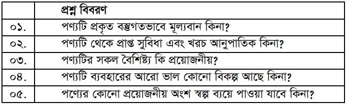 এ প্রশ্নগুলোর উত্তর জানার মাধ্যমে ভ্যালু বিশ্লেষণ করে ক্রেতা পণ্যকে সুনির্দিষ্ট করে। এক্ষেত্রে প্রতিষ্ঠান তাদের পণ্য মান নির্দিষ্টকরণে বিভিন্ন বিভাগের সমন্বয় করে থাকে ।