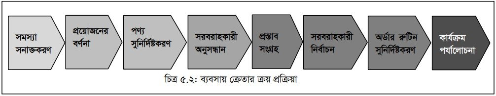 ব্যবসায় পণ্যের ক্রেতারা নিজের ব্যক্তিগত প্রয়োজনে পণ্য ক্রয় করে না করে মূলত পুনঃউৎপাদনের জন্য পণ্য ক্রয় করে। একারণে এ পণ্যের সিদ্ধান্ত গ্রহণ প্রক্রিয়ায় ভিন্নতা রয়েছে। সাধারণত নতুন ধরনের পণ্য অথবা প্রতিষ্ঠানের প্রথমবার ব্যবসায় পণ্য ক্রয়ের ক্ষেত্রে ক্রেতা নিম্নলিখিত চিত্র ৫.২ এর আটটি স্তর অতিক্রম করে পণ্য ক্রয় করে থাকে।