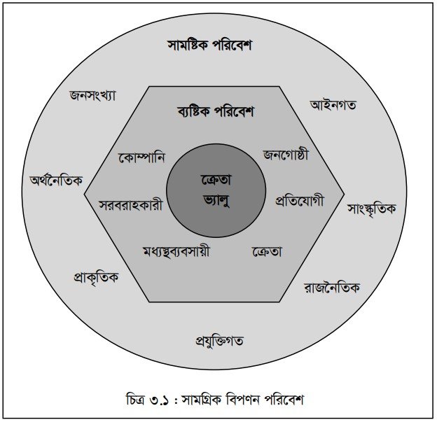 কোনো একটি পণ্য বা সেবা বিপণন করতে গেলে যে সমস্ত নিয়ন্ত্রিত ও অনিয়ন্ত্রিত উপাদান বা শক্তি প্রভাব বিস্তার করতে পারে, তাদের সমষ্টিকে বিপণন পরিবেশ বলে। ব্যষ্টিক ও সামষ্টিক দুই ধরনের উপাদান নিয়ে বিপণন পরিবেশ গঠিত। চিত্র ৩.১ এ সামগ্রিক বিপণন পরিবেশ দেখানো হয়েছে। পাঠ ১ এ ব্যষ্টিক পরিবেশ এবং পাঠ ২ এ সামষ্টিক পরিবেশ নিয়ে আলোচনা করা হয়েছে।
