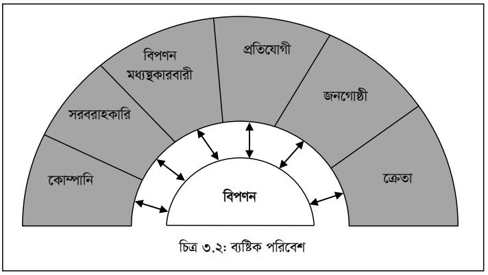 নির্দিষ্ট কোনো পণ্য বা সেবা বিপণনে যে সমস্ত বিষয়, পক্ষ বা শক্তিসমূহ পণ্য বা সেবার উপর প্রভাব বিস্তার করে, তাই হলো পণ্যের বিপণন পরিবেশ। ব্যষ্টিক ও সামষ্টিক দুই ধরনের উপাদান নিয়ে বিপণন পরিবেশ গঠিত। কোনো পণ্য, সেবা বা ধারণা বিপণনে প্রতিষ্ঠানের ভিতরকার বা খুব কাছাকাছি এমন শক্তিগুলো নিয়ে ব্যষ্টিক পরিবেশ সৃষ্টি হয়। যার মধ্যে রয়েছে কোম্পানি, সরবরাহকারী, মধ্যস্থব্যবসায়ী, ক্রেতা, প্রতিযোগী এবং জনগোষ্ঠী। এই পরিবেশের উপাদানগুলো | প্রতিষ্ঠানের কার্যক্রমে সরাসরি প্রভাব বিস্তার করে এবং প্রতিষ্ঠান এই উপাদানগুলো নিয়ন্ত্রণ করতে পারে।
