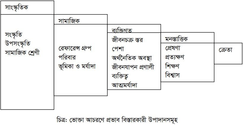 তবে সামাজিক, সাংস্কৃতিক, ব্যক্তিগত এবং মনস্তাত্ত্বিক উপাদান দ্বারা ভোক্তার ক্রয় আচরণ ব্যাপকভাবে প্রভাবিত হয়। এই উপাদানগুলো প্রায় ক্ষেত্রেই বিপণনকারীর পক্ষে নিয়ন্ত্রণ করা সম্ভব হয় না তবুও এগুলোকে বিবেচনার মধ্যে রেখে একজন বিপণনকারীকে তার পণ্য ও সেবা বিপণন করতে হয়। পণ্য ও সেবা ক্রয়ের ক্ষেত্রে যে সকল উপাদান প্রভাব বিস্তার করে সেগুলো চিত্রে দেখানো ও ব্যাখ্যা করা হলো।